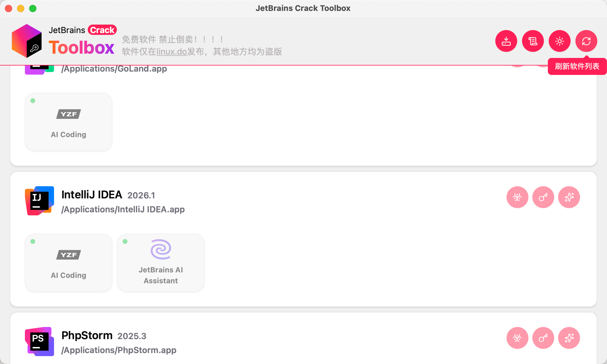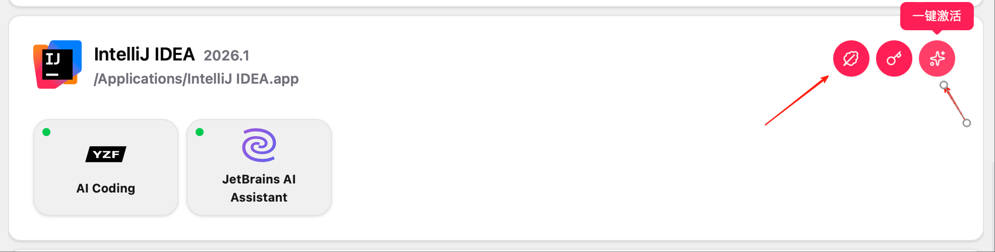 Jetbrains官方最近发布了最新的2026.1版本,不少小伙伴在后台留言说工具失效了,也有因为是内网开发需要离线的,今天分享一款离线全家桶激活工具,懒人专属,一键激活全部IDEs和插件,操作便捷,支持最新版本2026.1,同时支持Mac、Win、Linux下使用。按教程操作即可完美激活。