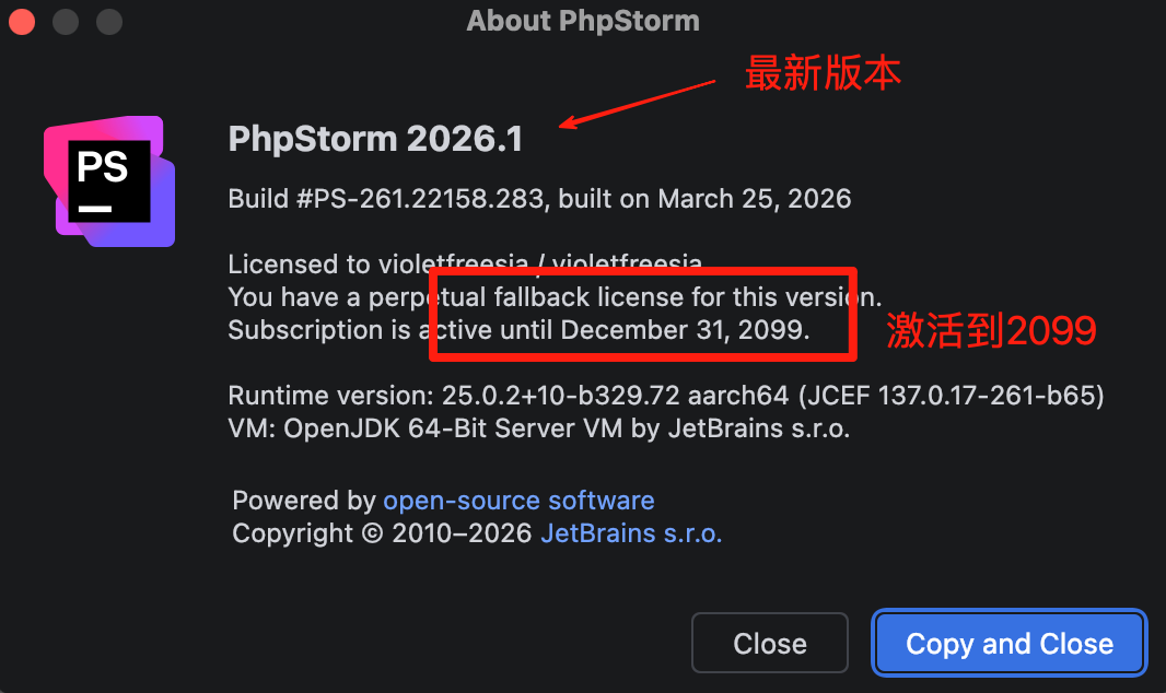 Jetbrains发布2026年一次大的版本更新,直接到了PhpStorm 2026.1版本,后台不少小伙伴留言反馈IDE升级后无法激活了,检查发现,Jetbrains官方再次升级了检测力度,新增了一些检测方法,造成部分工具失效,这里不在过多说明。下面提供一个新的激活工具,也是基于ja-netfilter魔改。大家按教程操作即可完美激活。