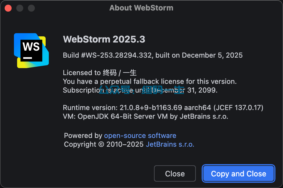JetBrains官方现在WebStorm最新版本是2025.3,今天给大家分享一款免费工具jetbra-free-2099,可以一键激活到2099,支持JetBrains全家桶激活,并支持页面操作,不污染环境变量配置,可以设置到期时间,自定义授权信息,非常便捷,对小白来说很友好,同时也支持所有插件激活。激活工具可以在文中获取,完全免费,支持官方最新版本。